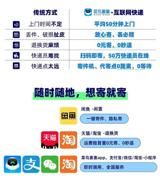 例如在寄快递方面,菜鸟裹裹不仅同步支持淘宝天猫,优化淘系的购物体验,还上线支付宝、甚至打通微信小程序,在多种平台上为用户提供个性化需求。与此同时,菜鸟裹裹还通过‘2 小时上门取件、一键寄件、运费自动垫付 0 元退换货’等方式,打造了全新的互联网快递标准。