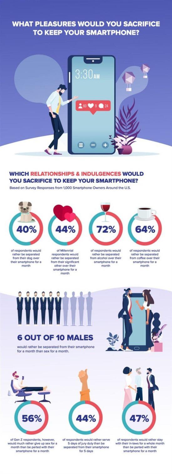 据SimpleTexting调查显示,72%的受访者宁愿一个月不喝酒,也不愿放弃他们的智能手机;64%的人宁愿放弃咖啡而不是他们的智能手机;另外在一月个的玩手机和一个月的情侣生活之间,53%的总体受访者和60%的男性选择手机。