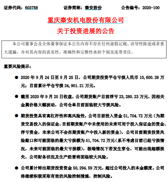 9月27日,秦安股份发布投资进展公告称,9月24日至9月25日,公司期货投资平仓亏损1.06亿元,目前累计平仓亏损2.49亿元。同时,截至9月25日收盘,公司期货账户浮亏2.33亿元。