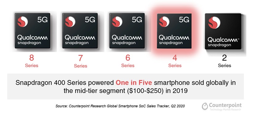 此外,记者注意到,9月初高通正式对外公布5G芯片的最新进展,计划在2021年初将5G移动平台产品组合扩展至高通骁龙4系平台。从过往产品的发布规律看,高通骁龙400主要定位中端入门级,这意味着高通正在快速推动5G手机价格的进一步下探。