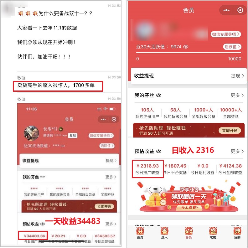 还放出了一大堆去年双十一的高额佣金图片,表示“淘宝客市场基本已经饱和了,京东还几乎是空白”“只要努力,收益翻 3 - 5 倍很正常”: