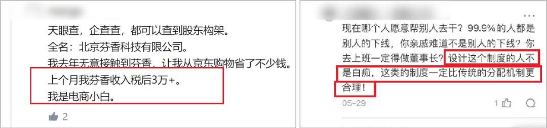 为了防止被打成“传销”,芬香在这方面格外谨慎,反复强调自己“不收人头费”,而且商品都是京东商家直接发货,不是传销。