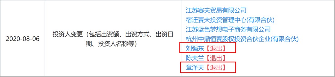 而且,今年8 月,刘强东和章泽天还都退出了这家公司的投资人: