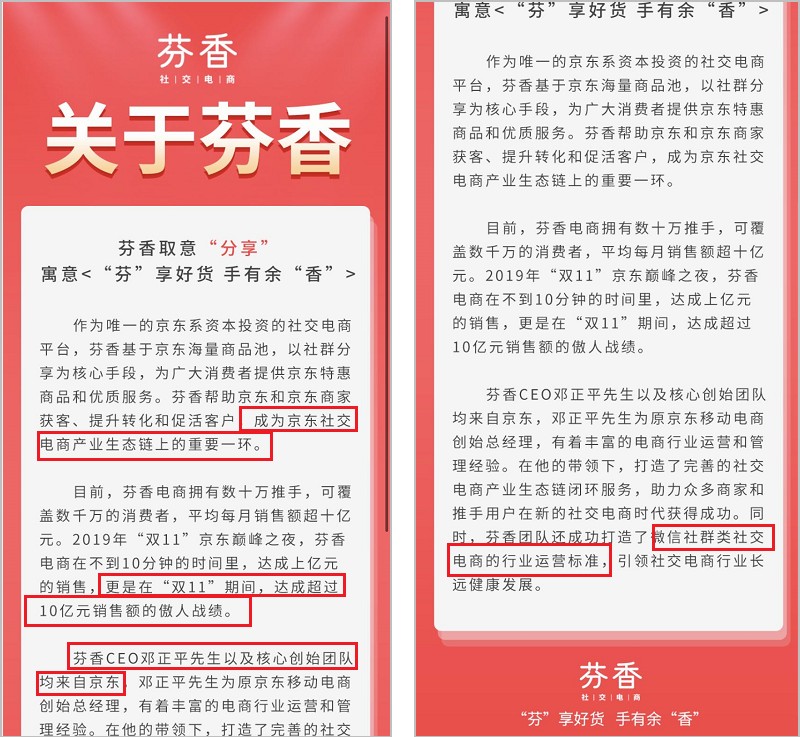 芬香给自己的官方定位相当高大上,说自己是「京东社交电商产业生态链上的重要一环」,还要“打造微信社群类电商的行业标准”: