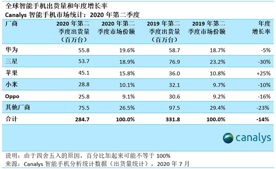 市调机构Canalys数据显示,2020年第二季度,华为、三星、苹果、小米、OPPO这5家厂商在全球市场出货量市场份额合计达73.5%。第二季度,华为、vivo、OPPO、小米、苹果这5家厂商在中国大陆市场份额达95.5%。