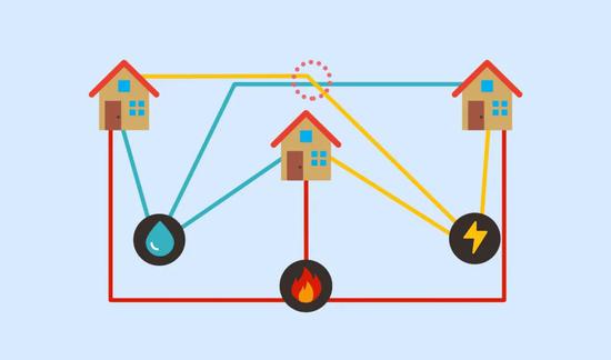 因此,“三个公用设施问题”在实质上讨论的是,对一个图形来说,如何在连线不交叉的情况下将节点连接;以及如何利用算法,来确保当对一个图形被更改后,仍然能保持可平面性。