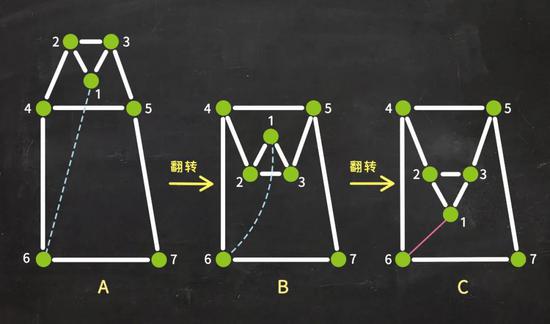 现在,如果添加一条连接平面图中的两个节点的额外的连线,比如让这节点1和6相连,那么假如从A开始,它需要连续翻转两次才能使节点1和6的相连不与其他任何边交叉。