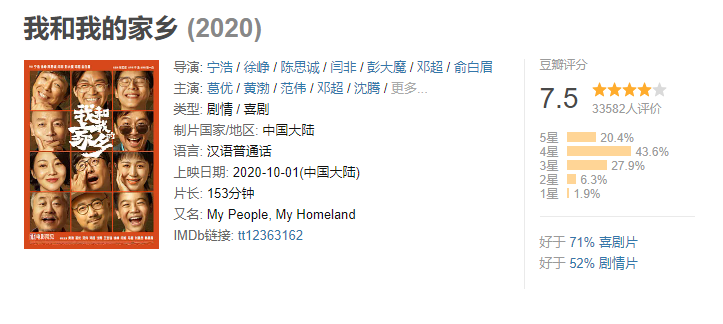 国庆长假首日,票房仅次于《姜子牙》的,则是由北京文化出品的《我和我的家乡》,首日票房达到2.67亿元,截至发稿,两日票房达到3.25亿元,后劲十足,该片豆瓣评分7.5分。