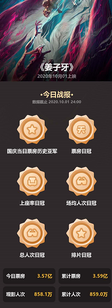 依托《哪吒之魔童降世》的口碑,《姜子牙》目前暂时为今年国庆档最大赢家,票房飙升势如破竹,10月1日上午,动画电影《姜子牙》中国内地首日票房已达1.85亿元,一举刷新内地电影市场动画电影首日票房纪录。而此前纪录由《哪吒之魔童降世》的1.44亿保持。
