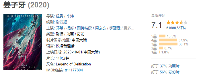光线传媒作为《姜子牙》主投方,今年上半年因为疫情冲击业绩低迷,营收净利润均双双下滑。但随着国庆首日票房高达亿,豆瓣评分7.1分,《姜子牙》可谓名利双收,正式成为今年国庆档爆款。