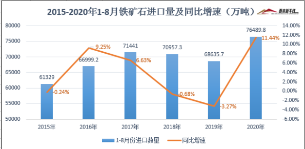 铁矿石方面,据海关总署数测算,2020年8月我国进口铁矿砂及其精矿1亿吨,同比增长5.81%,8月份,钢协发布的进口铁矿石平均价格达到119.93美元/吨;1-8月我国累计进口铁矿砂及其精矿7.59亿吨,同比增长11.44%,累计进口金额为706亿美元,累计平均进 口单价为92.9美元/吨。