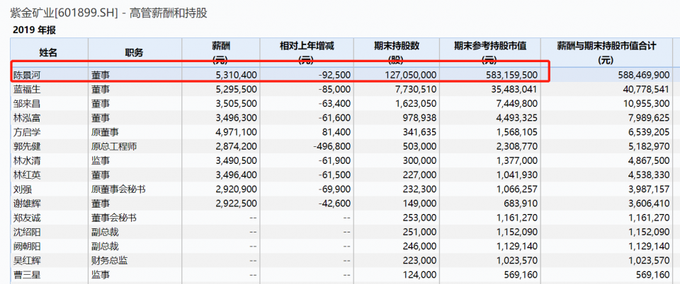 豹变发现,陈景河在紫金矿业的持股一度高达1.2705亿股,上半年转让5100万股给儿子后,所余股份最新市值依然达4.43亿元,目前年薪531万。