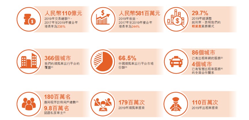 业务规模方面,2019年,嘀嗒出行平台交易总额(GTV)为110亿元人民币,2017年至2019年年复合增长率为238%。招股书称,根据咨询公司弗若斯特沙利文报告,2019年嘀嗒出行在顺风车市场排名第一,市占率为66.5%,在出租车网约市场排名第二。