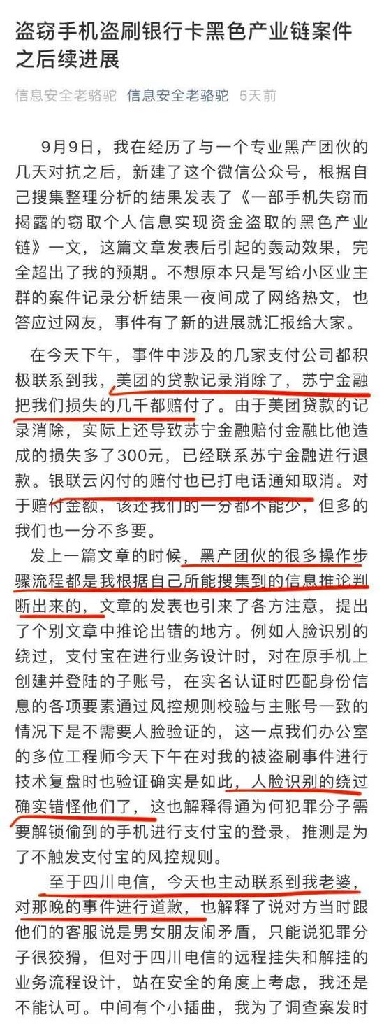 美团消除了贷款记录,苏宁金融赔付了相关损失。四川电信也致电道歉,称被黑产以“男女朋友闹矛盾”哄骗,导致反复挂失与解挂。