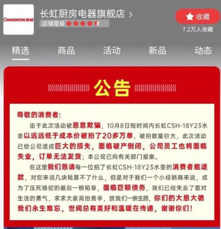 为何会出现这样的情况?媒体报道称,10月10日该店铺发表公告,称遭遇了恶意欺骗,10月8日长虹CSH-18Y23水壶以远低于成本价被拍了20多万单,被拍数量巨大,此次活动已经给公司造成了就巨大的损失,面临着破产倒闭、公司员工面临失业,订单也无法发货。