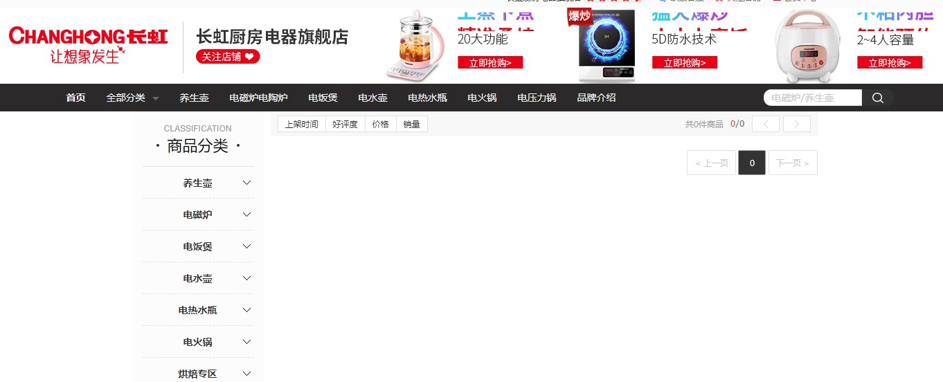 这家店铺叫做长虹厨房电器旗舰店,主要出售各种电磁炉、电陶炉、电饭煲、电火锅等厨电产品,还有热水壶,不过目前店铺中这类产品已经全部清空了。