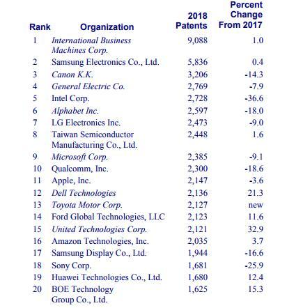 IPO指出,2018年共有307759项专利发布,低于2017年的318829项。按国家划分,前十名中有六家美国公司,韩国有两家,日本和中国台湾各有一家公司。