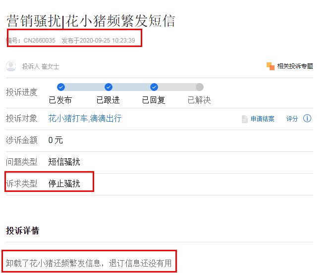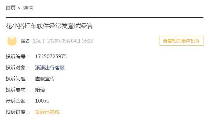 其中更是针对花小猪营销骚扰专门设立了一个集体投诉专题。
