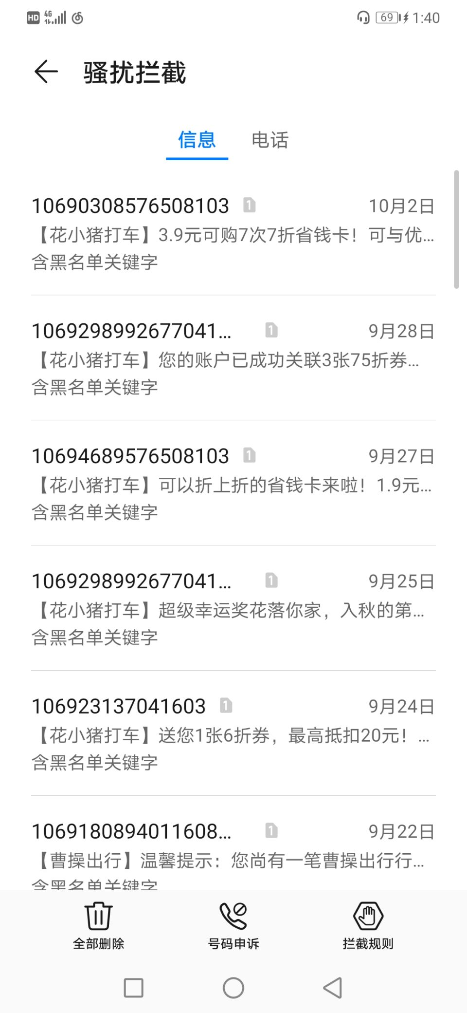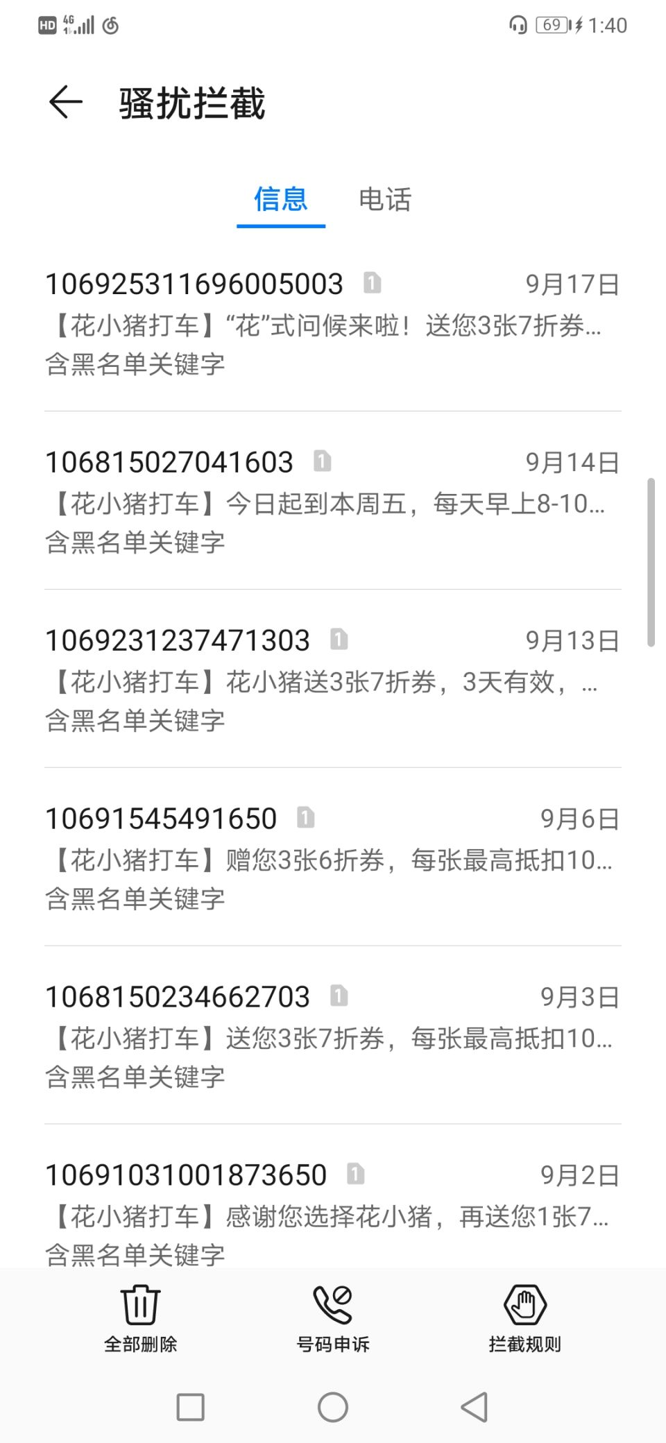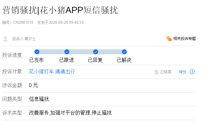 9月26日,黄女士对“花小猪打车”发起投诉说,一天好多条短信骚扰、就一个小时内就两条了,麻烦处理一下问题,停止对他人的骚扰。