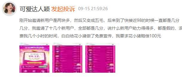 据消费者反映,刚开始便参加活动,按规则拉了几十好友,成为花小猪的新用户,活动奖励金很快达到98.9元,然而出乎意料的是无论在如何邀请好友,活动奖现金一直停留在98.9元。