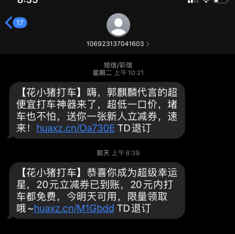 根据徐女士上传的截图显示,其确实收到不少“花小猪打车”发来的各种信息。