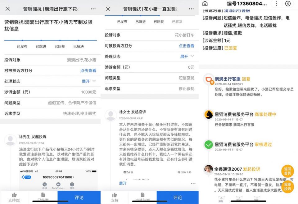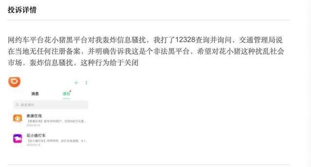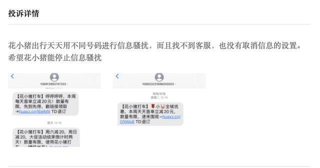 10月8日,消费者徐女士在第三方投诉平台称:本人并未注册关于花小猪任何打过车,不知道是从什么地方还是什么,不管我是有没有用过什么的,也不能天天给我发那么多骚扰短信,更巧合的是我身边的朋友都有类似的情况。