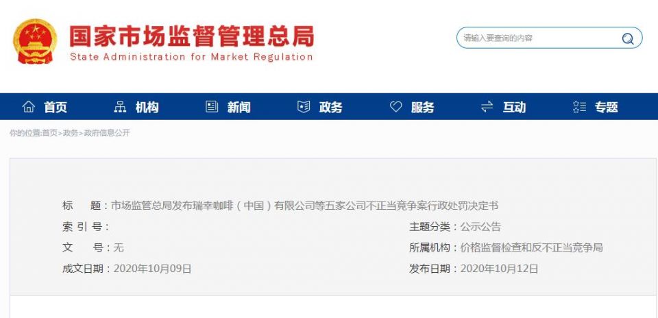 今日下午,市场监管总局官网发布公告称,2020年9月18日,市场监管总局对瑞幸咖啡(中国)有限公司、瑞幸咖啡(北京)有限公司、北京车行天下咨询服务有限公司、北京神州优通科技发展有限公司、征者国际贸易(厦门)有限公司等五家公司不正当竞争违法行为作出行政处罚决定。
