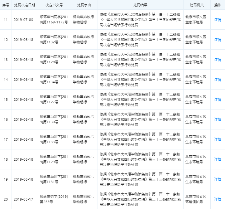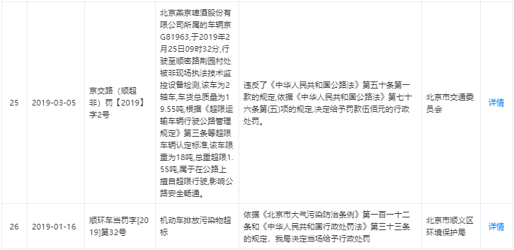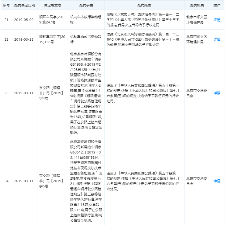 天眼查显示,2019年1月-7月,燕京啤酒收到26个行政处罚。其中,有23个是由北京市顺义区生态环境局发布的处罚,处罚事由为机动车排放污染物超标。