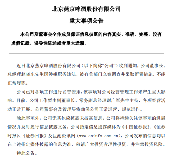 10月8日晚间,北京燕京啤酒股份有限公司(以下简称“燕京啤酒”)发布公告称,公司董事长、总经理赵晓东因涉嫌职务违法,被有关部门立案调查并采取留置措施,不能正常履职,公司工作暂由副董事长谢广军主持。