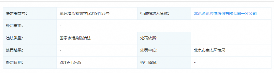 另外,据公开资料显示,北京燕京啤酒股份有限公司一分公司在2019年12月25日,收到北京市生态环境局,京环境监察罚字[2019]155号的行政处罚决定书。