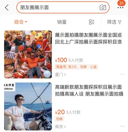 当然,这种花小钱装大款的“人设”经营产业,的确存在,且有人消费。在电商平台搜索“朋友圈展示面”,就可以一探究竟。