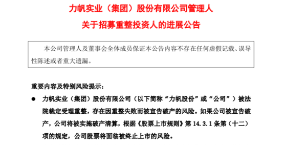 力帆股份还在公告中提示风险,表示本次立案调查事项系针对公司控股股东以及实际控制人的调查,与公司的日常经营管理和业务活动无关,对公司的正常经营不产生影响。另外,公司被法院裁定受理重整,存在因重整失败而被宣告破产的风险。即使公司实施重整并执行完毕,但公司后续经营和财务指标如果不符合《股票上市规则》等相关监管法规的要求,公司股票仍存在被实施退市风险警示或终止上市的风险。