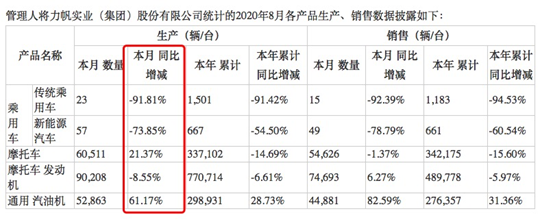 根据其最新披露的8月产销快报数据显示,8月单月销售传统乘用车15辆,同比锐减超九成;销售新能源汽车49辆,同比锐减79%。不过摩托车产销情况略好,8月生产摩托车600511辆,同比增长21.37%;销售摩托车54626辆,同比减少1.37%。