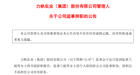 10月13日,力帆股份还发布了管理人关于公司监事辞职的公告,表示力帆股份监事会于近日收到监事兰庭琴女士的书面辞职报告,监事兰庭琴女士因个人原因辞去公司监事职务,辞职后不再担任公司任何职务。