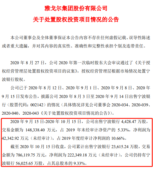 今年8月12日~8月31日,雅戈尔出售宁波银行4844.71万股,交易金额为16.29亿元,占2019年末经审计净资产的5.86%,产生投资收益8.98亿元,净利润4.68亿元(未经审计),占2019年度经审计净利润的11.77%。