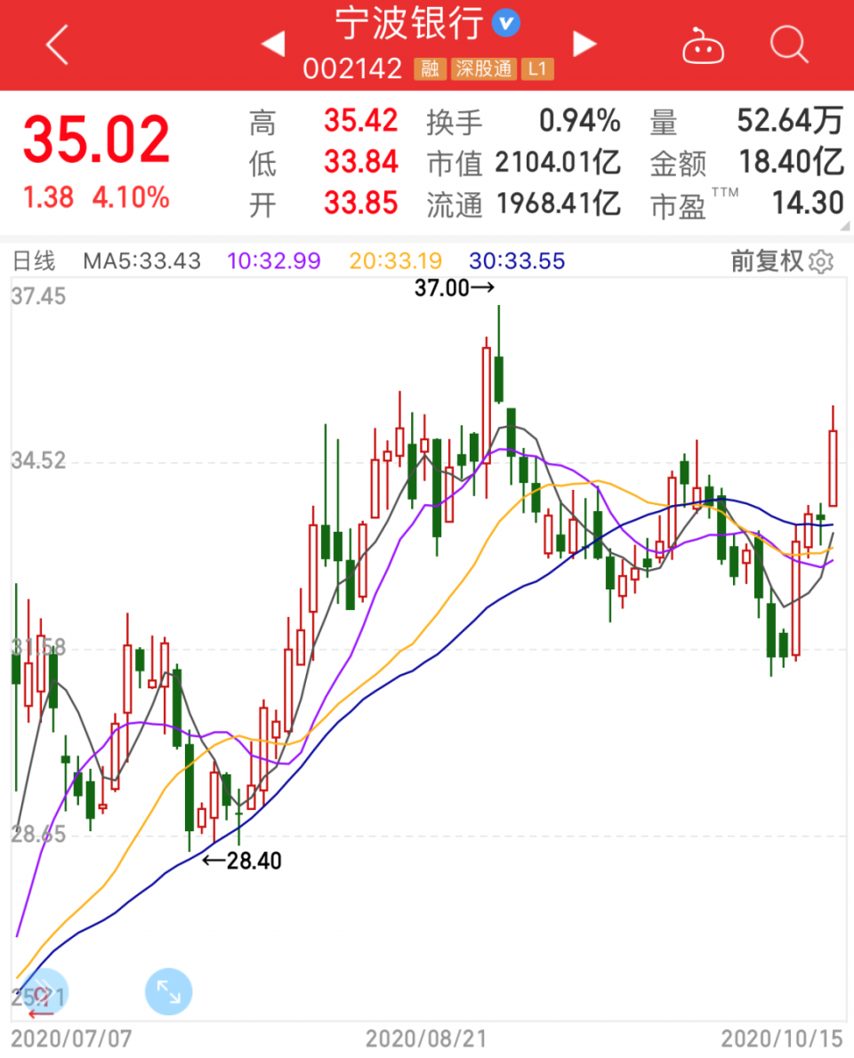 对于银行板块来说,10月15日沪深两市36只上市银行均实现了不同程度上涨,其中杭州银行涨幅居首为5.31%;其次是宁波银行涨4.1%,截至10月15日收盘价为35.02元。