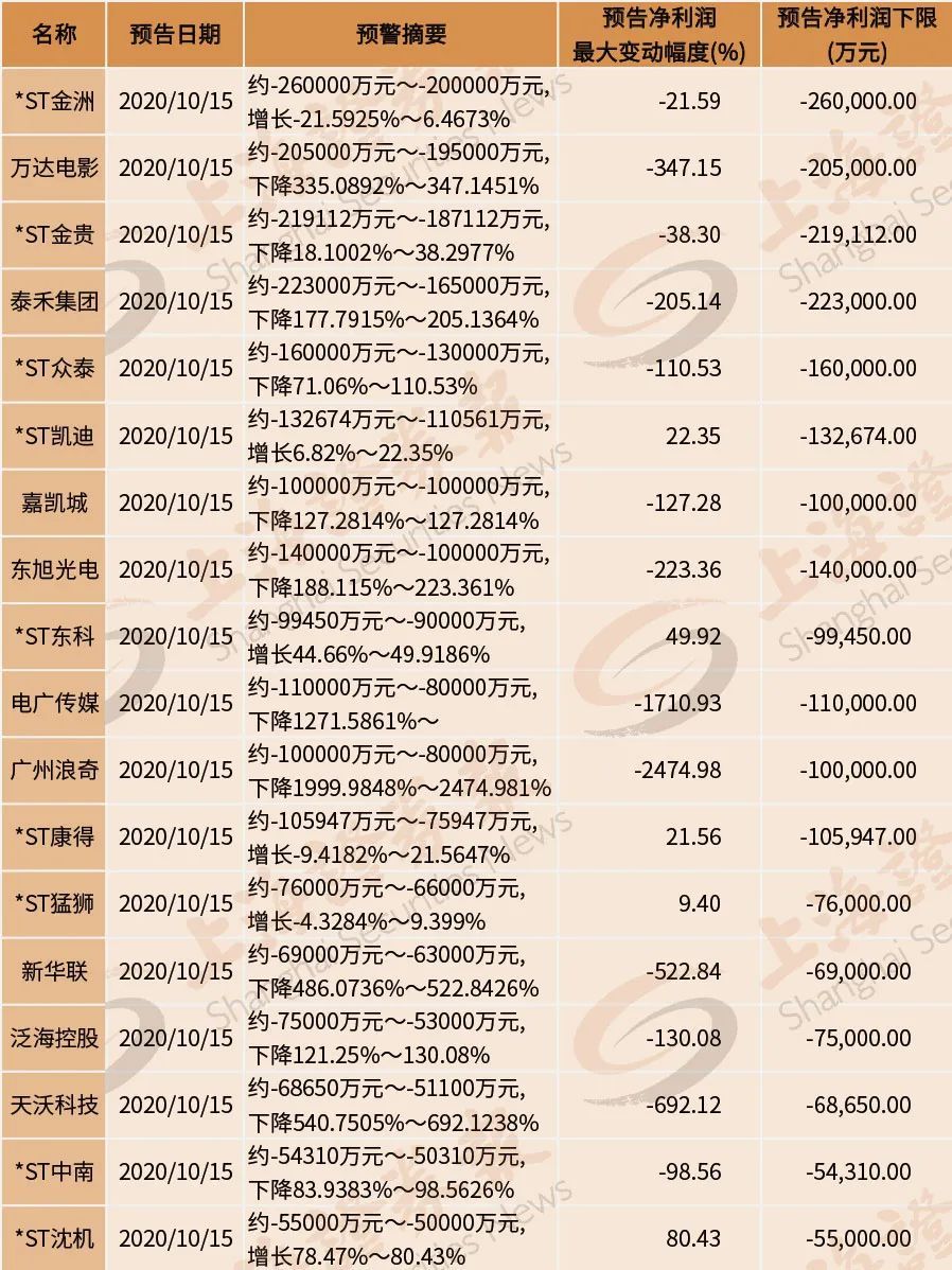 10月15日,多家上市公司发布三季报业绩预告,预计2020年前三季度将会出现高达数亿元、十数亿元的巨额亏损。