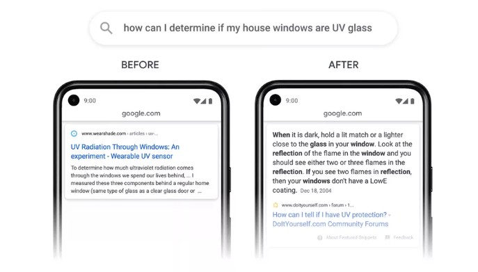 另一个新变化是:谷歌搜索现在可以从网页中索引单个段落,而不仅仅是整个网页。例如,如果用户搜索“如何确定我家的窗户是否是UV玻璃”,新算法可以在一个DIY论坛上找到单段文字来寻找答案。根据Edwards的说法,当该算法在下个月开始推广时,它将改善所有语言中7%的查询。