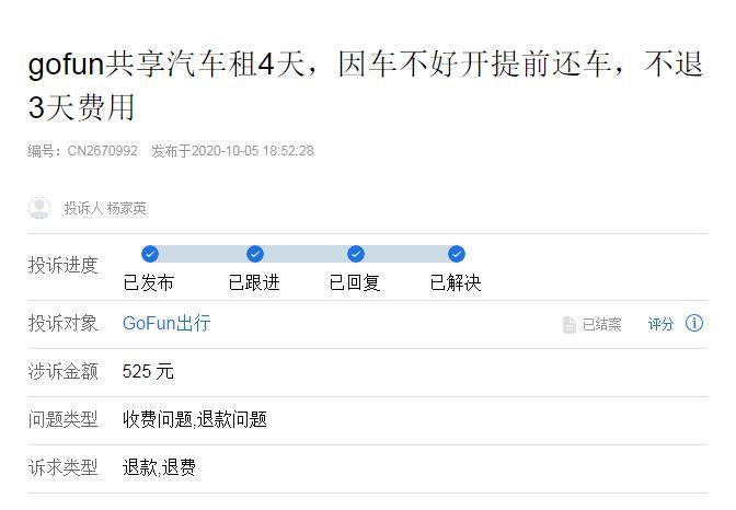 另一位叫姜自豪的消费者在租车过程中,遇到了退款难。9月13日,他投诉说,本人于2020年9月4日晚上,租用gofun出行公司车辆一辆,当时上车后第一下打不着火,故上报问题,后打着火,启动车辆后因临时改变行程,取消用车 故同一地点还车。