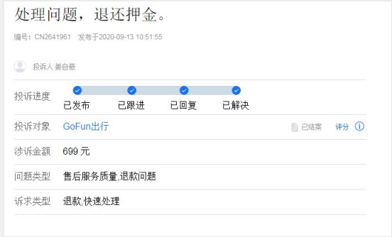 遇到退款难的还有胥先生。9月11日,胥先生发起投诉称,gofun共享汽车总是一而再再而三的拖欠押金退回。按着合同来看时间已经到了,但就是不退押金。客服也都是敷衍了事。我就退个押金有那么困难?还是你们公司没有钱退了?如今天在不退我就消费者协会在投诉你们。