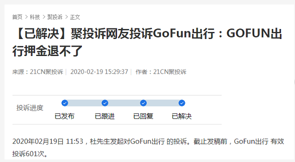检索发现,关于gofun退款难并不是近期才发生。早在年初的2月19日,第三方投诉平台21聚投诉就做过相关统计,2020年02月19日 11:53,杜先生发起对GoFun出行 的投诉。原因是退款难,截止当时发稿前,GoFun出行有效投诉高达601次。