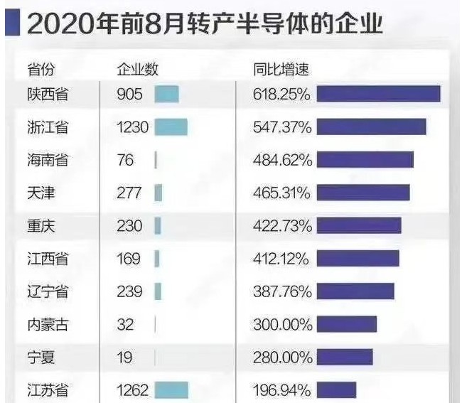 工商数据显示,截止到上个月,今年全国已经有9335家企业转做半导体,陕西省转产半导体的企业,同比增速高达618.25%。