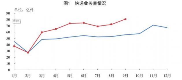 1-9月,全国快递服务企业业务量累计完成561.4亿件,同比增长27.9%;业务收入累计完成6098.8亿元,同比增长15.7%。其中,同城业务量累计完成88.7亿件,同比增长13.3%;异地业务量累计完成460.2亿件,同比增长31.2%;国际/港澳台业务量累计完成12.5亿件,同比增长25.4%。9月份,全国快递服务企业业务量完成80.9亿件,同比增长44.6%;业务收入完成824.3亿元,同比增长27%。