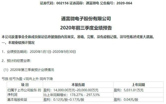 比如,通富微电在三季度业绩预告中表示,公司第三季度继续保持上半年经营增长趋势,国内客户订单明细增加,国际大客户订单需求强劲,海外大客户通讯产品需求旺盛。通富微电披露,其前三季度净利润同比增长178.27% - 297.53%。