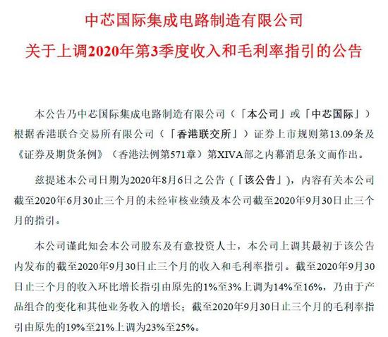 10月16日,中芯国际发布了上调第三季度收入和毛利率指引的公告。公司将第三季度的收入环比增长由原先的1%至3%上调为14%至16%,毛利率由原先的19%至21%上调为23%至25%。