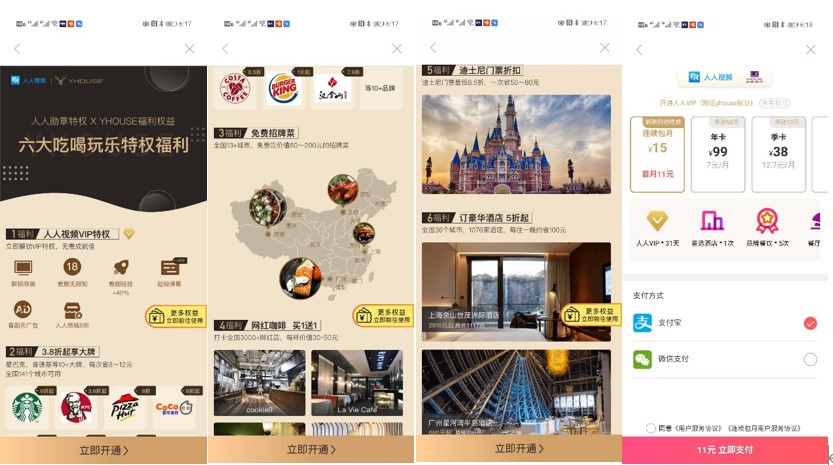 另一个主要收入来源是会员收入。虽然人人视频的内容几乎都可以免费观看,但其会员的功能不限于自身平台。通过展开外部合作,人人视频会员的功能从餐饮到酒旅,多方覆盖,功能极为丰富,提高了其会员的附加值。即使大部分人通常想不起来使用会员的其他权利,也会在购买时觉得附加值很高,年卡一个月平均7元的会员费可以忽略不计。