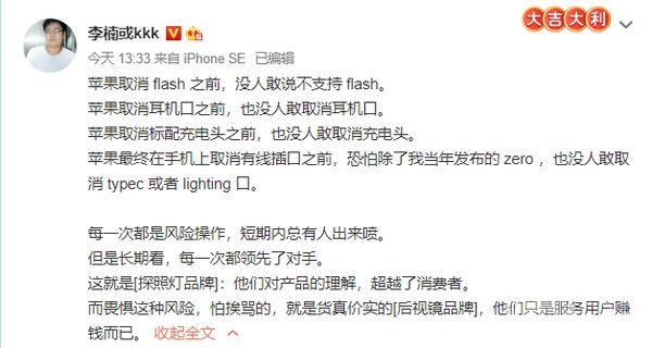 李楠表示,“后视镜品牌”只顾赚钱,而“探照灯品牌”总会有些风险操作,因为他们对产品的理解已经超越了消费者。为了证明自己的观点,李楠先后列举了苹果取消flash、耳机孔的两件事,称苹果在取消标配充电器前没人有勇气取消充电头。最后李楠还是回到了自己身上,称魅族当年发布zero前,也没人敢取消Type-C或者Lightning接口。