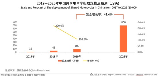 艾媒咨询发布的2020年共享电单车研究报告显示,2019年中国共享电单车数量已超过100万辆。未来五年,随着各大平台稳步推进共享电单车投放布局,用户共享电单车需求将进一步得到激发,尤其在三四线城市的渗透率将保持快速增长态势,预计2025年共享电单车投放车辆可达到800万辆,收入规模将达到200亿元。