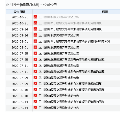 面对股价的异常波动,在2020年内,正川股份多次发布股票交易异常波动公告。