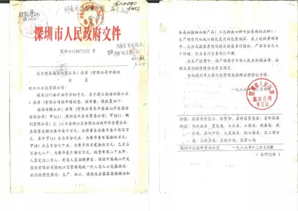 1987年12月4日,深圳蛇口工业区有限公司申报的“[87]南开函字第90号文”正式得到批复。益海嘉里前身、中国第一家大规模现代化食用油加工厂——南海油脂工业(赤湾)有限公司,就此诞生。